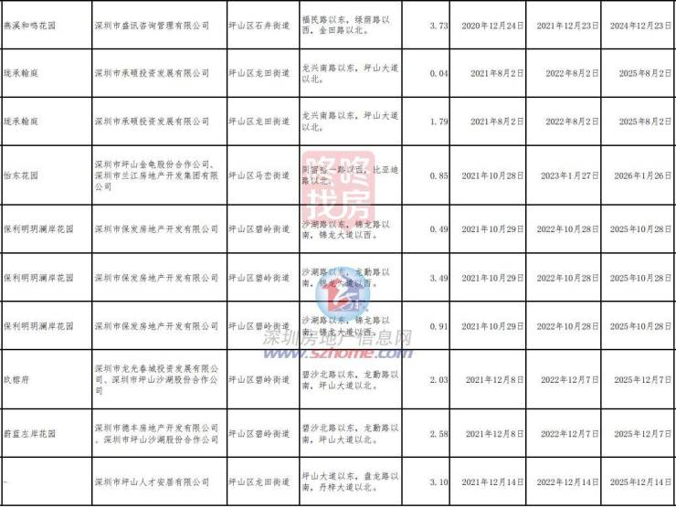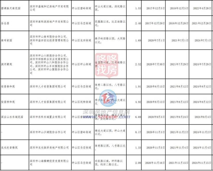 宝龙街道11个,包括宝翠雅苑等;园山街道24个,包括信义御元山居、星河盛境都荟大厦等;南湾街道3个;龙城街道12个,包括金域学府等,坪地街道5个。