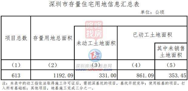 项目总数613个,存量用地总面积1192.09公顷,其中,未动工土地面积331.00公顷,已动工土地面积861.09公顷(其中未销售 土地面积353.45公顷)。