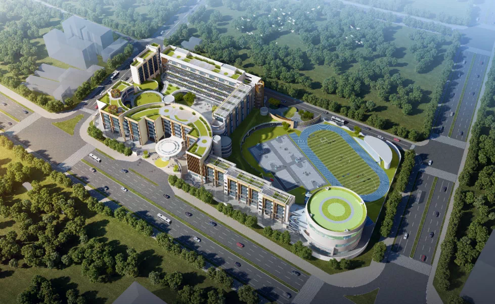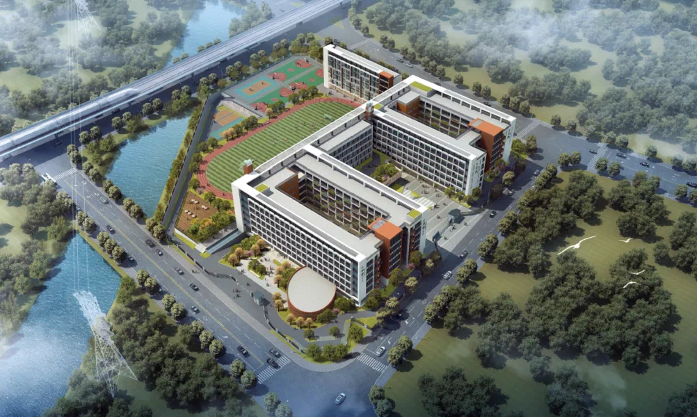 学校规模:建设用地面积为16897.22平方米,总建筑面积约为40883.87平方米,建设规模为36个班,1620个学位,建设内容主要包括6层教学楼、13层办公楼、宿舍综合楼和运动场等。