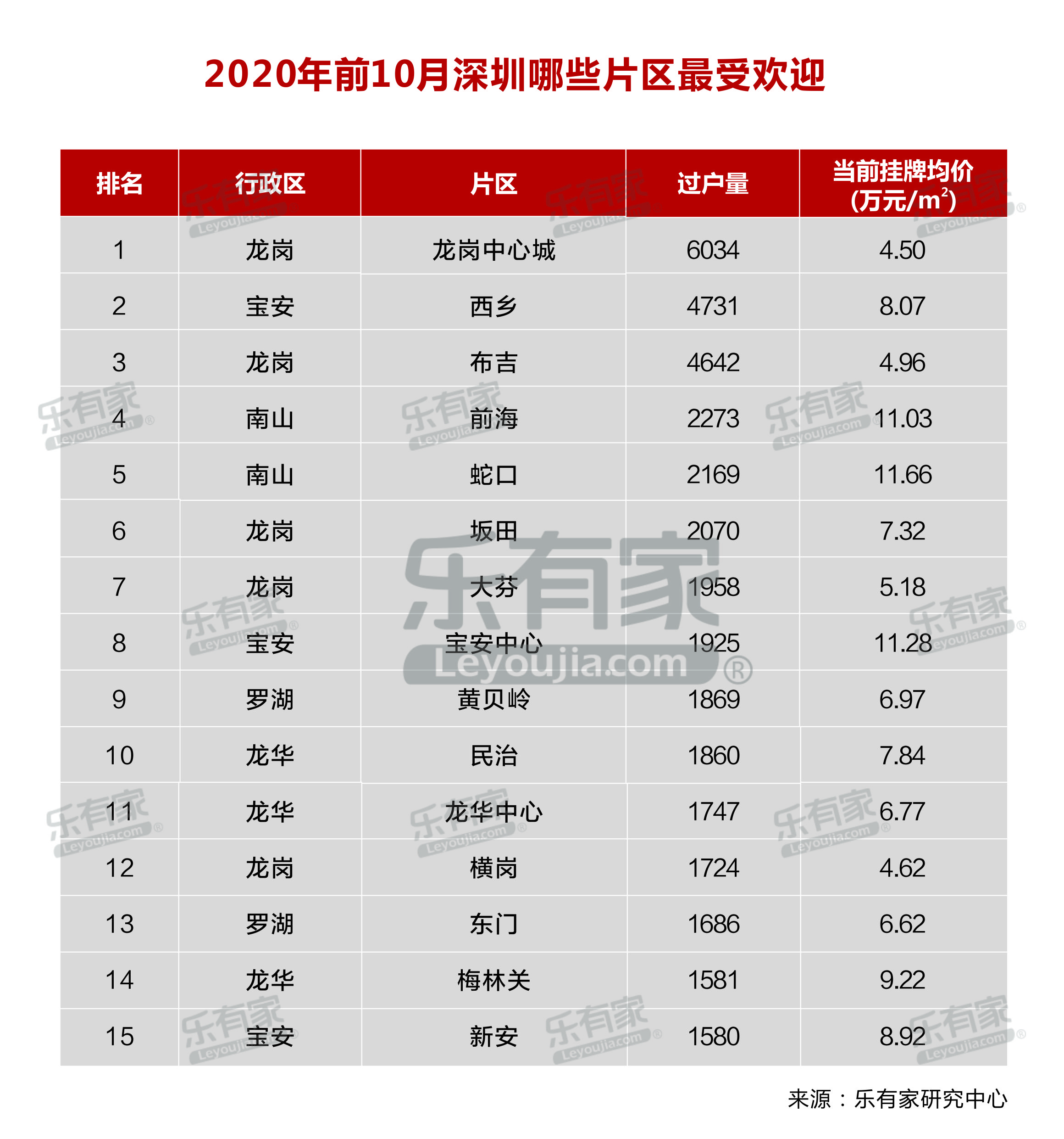 前10月,龙岗中心城、西乡和布吉成为二手住宅过户量前三的片区,预计拿下年度前三不成问题。龙岗中心城更是常年霸榜冠军宝座。前15名的片区里,龙岗占5席,宝安占3席,龙华占3席。个别价格较高的片区过户量也有不错的成绩,前海与蛇口均排上前五,可见深圳购买力不容小觑。