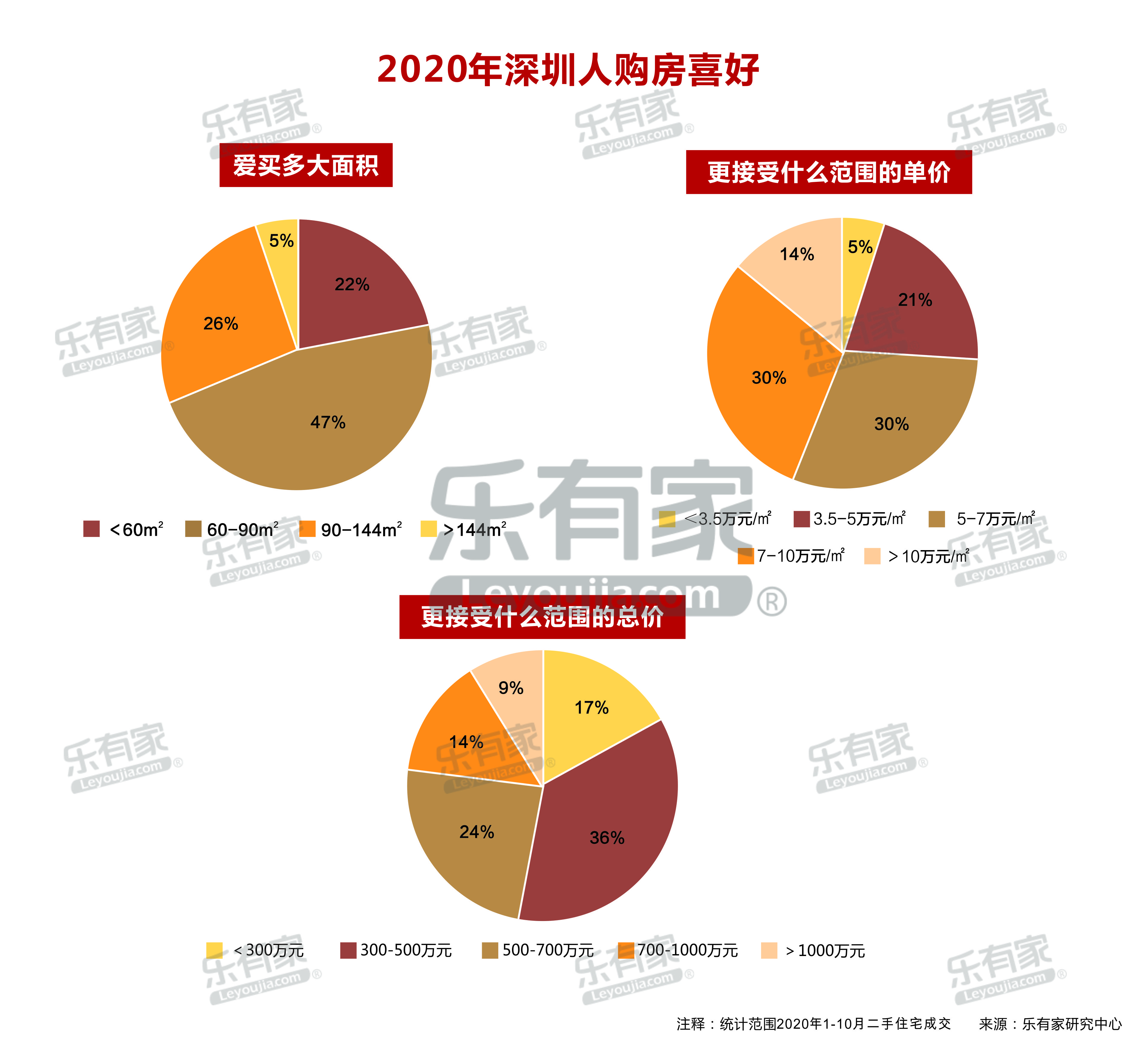 从深圳乐有家成交客户喜好来看,60-90㎡的房源依然是购房者的最爱,其次是90-144㎡,而超过144㎡的非普通住宅购买比例是最少的。
