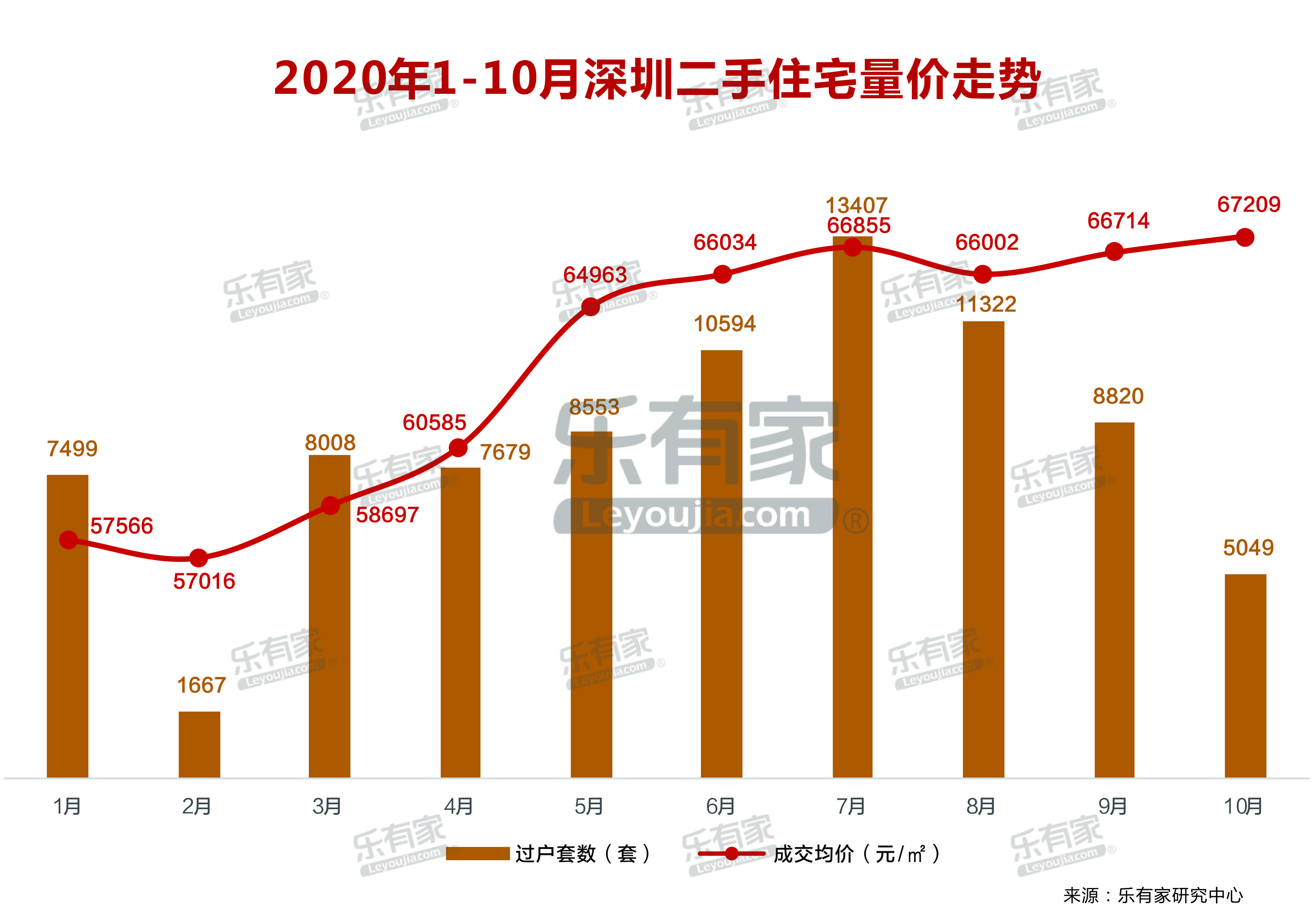 从1到10月,深圳二手住宅过户套数经历了明显的起伏。2月受疫情宅家影响,大量购房需求被抑制,在3月复工后集中释放。较高点出现在7月,13407套。同月出台“715”新政,随后过热的二手市场回归理性,过户量逐月下跌。