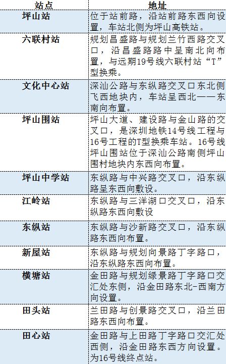 地铁16号线工程设11座地下车站(坪山区),分别为坪山站、六联村站、文化中心站、坪山围站、坪山中学站、江岭站、东纵站、新屋站、横塘站、田头站、田心站(均为暂定名)。