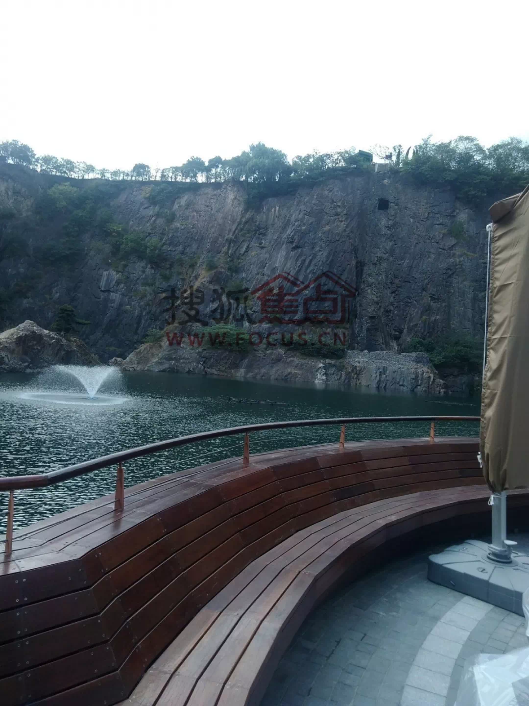 环视四周,水面上有环形泳池,观景台与建筑之间由廊桥相连,水榭亭台和喷泉,一样不少。峭壁之上有栈道,是当初运送建筑材料留下的,对面峭壁上方还建有空中玻璃栈道(下一个视角)。另外,酒店每间客房也都设有露台,可以全角度环顾整个矿坑的景色。