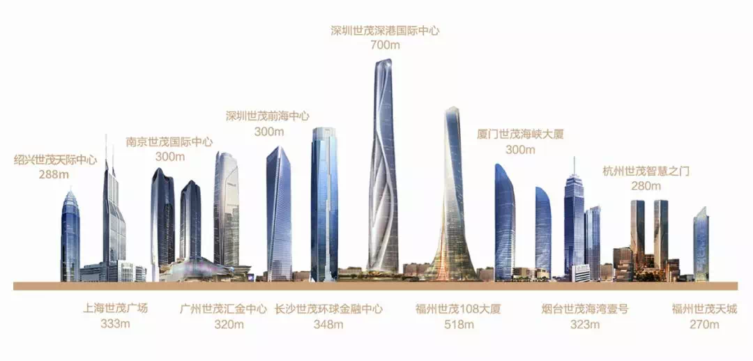 深圳(世茂深港国际中心:700米)、福州(世茂108大厦:518米)、长沙(世茂环球金融中心:348米),上海(世茂广场:333米)、还有广州、厦门,南京、杭州、烟台、绍兴均有世茂的摩天高楼项目,而仅在深圳一城,世茂便落子三地标:龙岗(世茂深港国际中心)、前海(世茂前海中心)、坪山(300米摩天高楼,名称暂未公布)。