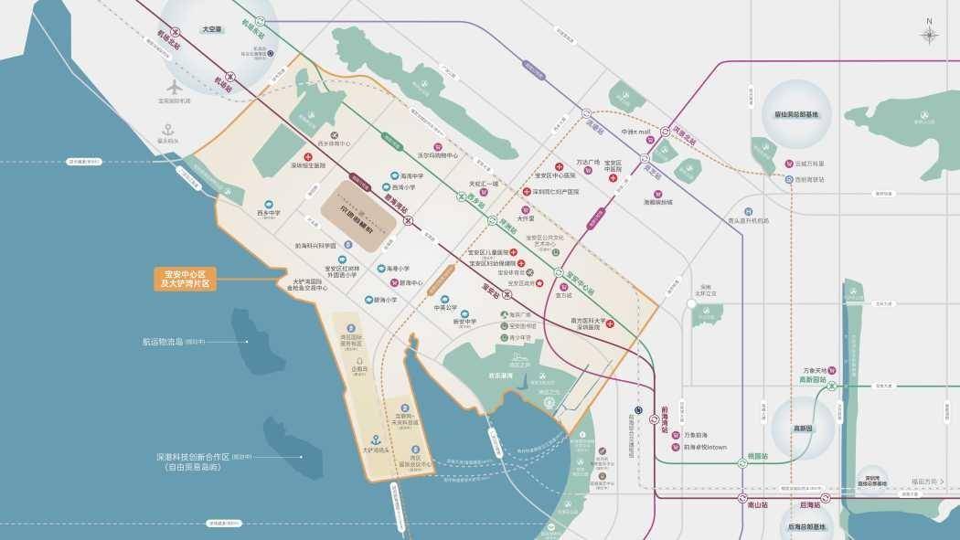 交通:地铁11号线碧海湾站A口0距离,项目距离宝安国际机场仅一个地铁站,城市主干道:宝安大道、西乡大道、滨海大道 教育:小学:根据去年秋季招生范围来看,与西湾小学、碧海小学、海港小学、红树林外国语小学共享小学学区。中学:对口深圳市海湾中学,该校是宝安首批优质学校。 商业:项目对面榕江壹号院1.3万平集中商业。最近的是宝安西乡天虹商场大约800米距离。3公里范围内有宝安大仟里,金港城沃尔玛 文娱:附近就有西乡最大的体育中心,碧海湾公园、西湾红树林公园
