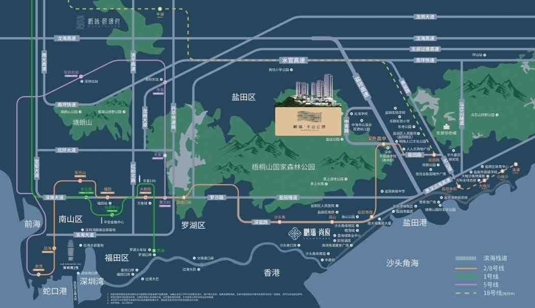 海:盐田金色海岸码头、沙头角口岸、莲塘口岸、梅沙旅游专用口岸(规划中),畅享半小时深港生活圈。 陆:距8号线/2号线深外高中站直线距离约700米,直达罗湖/福田,大小梅沙/东部华侨城;未来规划18号线——贯通东西的大动脉(宝盐线)。 空:东部通航直升机主运行基地。