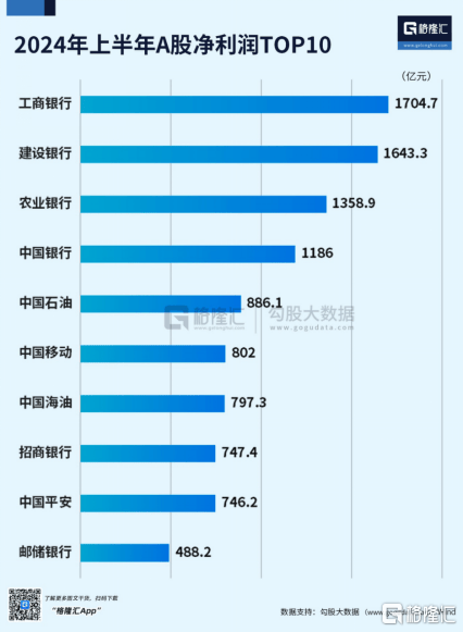 事实上,虽然当前银行净息差虽处于历史低位,但贷款利率仍存有明显的下降空间。首先,如果存量房贷款利率降了,存款利率肯定也会再次下降。况且,银行业净息差虽然在缩小,但放眼整个A股市场,目前最赚钱的还是银行。上半年,42家上市银行营业总收入合计规模2.89万亿,虽然比去年同期的2.95万亿有所下滑,但净利润合计1.1万亿,比去年多了40亿。下面这张图片,再清晰不过了,上半年净利润前十的企业,除了中石油、中移动两家,其他均来自银行业。