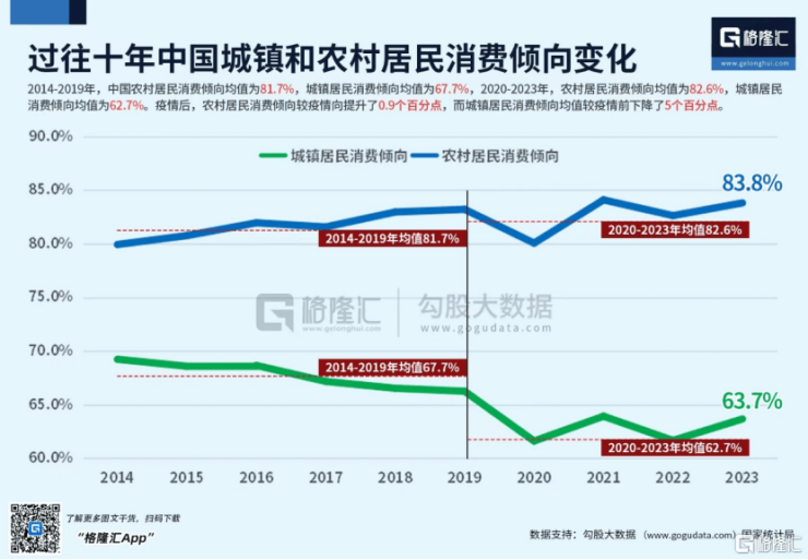 作为房贷主力的城市居民,消费形势更不乐观。经济学里有一个衡量居民消费意向的指标,叫消费倾向,是指一定时期居民用于消费的钱占其收入的比重。2020-2023年这四年,农村居民消费倾向均值为82.6%,城镇居民消费倾向均值则只有62.7%。疫情后,没有房贷压力的农村居民,消费倾向较疫情前还提升了0.9个百分点,而房贷重压之下的城镇居民,消费倾向较疫情前,继续大幅下降了5个百分点。