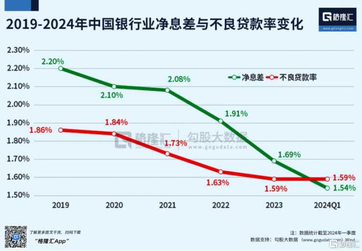 这就相当于老百姓存了6块钱,只贷了1块钱,和银行的债务关系完全逆转。银行不但不能从住户新增存贷款业务中赚到利差,还要以将近1:6的比例倒贴利息。资产端,居民提前还贷降低了利息收入,负债端住户存款大幅增长,增加了利息支出,结果就是银行业净息差进一步缩小。目前,我国银行业的净息差仅有1.54%,远低于1.8%的净息差评分警戒线,降至历史低位。