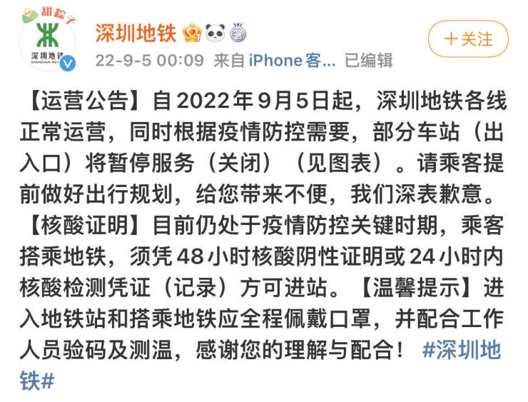 记者从深圳地铁了解到,9月5日起,深圳地铁全线网将恢复运营 。根据疫情防控需要,部分车站(出入口)仍将保持停运(关闭)状态。请乘客提前做好出行规划。