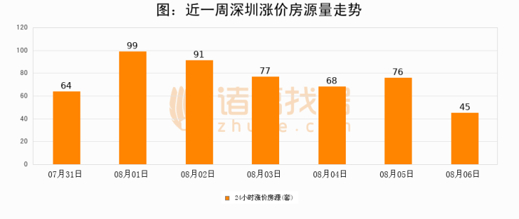 根据诸葛找房数据显示,深圳24小时涨价房源量为45套,较08月05日减少31套,环比下降40.8%。与此同时,涨价房源占比小幅回落,对于购房者来说是一个入市窗口期,购房者可抓住时机入市。