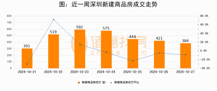 根据深圳市住房和城乡建设局数据显示,2024年10月27日深圳新建商品房成交384套,较昨日减少37套,环比下降8.8%
