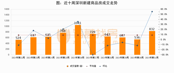 进入2024年第31周(07月29日-08月04日),深圳新建商品房成交832套,较上周增加296套,环比上涨55.2%。从近十周成交来看,周均成交套数为693套,本周成交832套,高于近十周平均成交量20.1%。