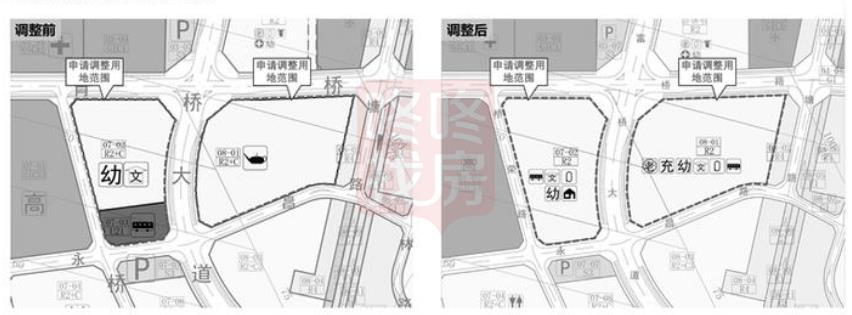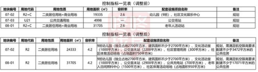 一宗居住用地和之前的公共交通用地(计划建设公交站场),调整合并成一大块宅地,宅地用地面积由原来的19335平增加到24333平,容积率由原来2.6提高到4.2。原计划的一所9班幼儿园不变。