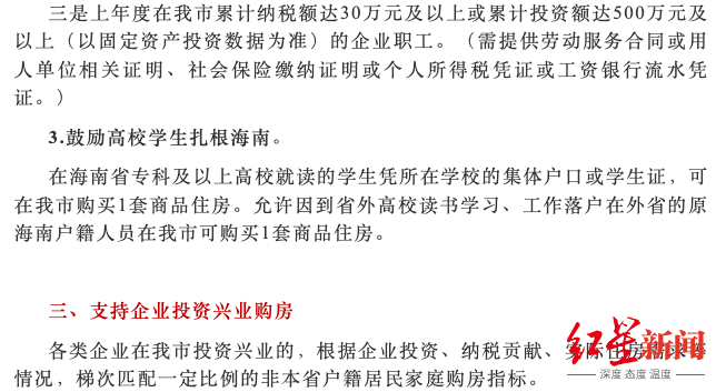 7月13日,“五指山市政府”公众号发布了五指山市住房和城乡建设局印发的《关于进一步优化调整房地产调控政策的通知》。在“支持人才购房”相关政策中提到:鼓励高校学生扎根海南。在海南省专科及以上高校就读的学生凭所在学校的集体户口或学生证,可在该市购买1套商品住房。允许因到省外高校读书学习、工作落户在外省的原海南户籍人员在该市购买1套商品住房。