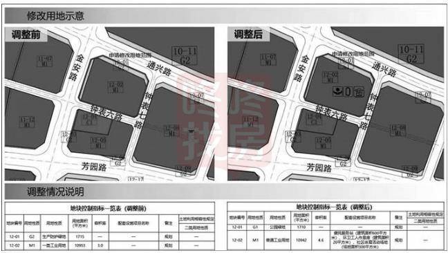 其中,12-01地块用地面积为1710平方米,用地性质依《深标》规范表达为公园绿地(G1),其他规划条件不变;12-02地块用地面积为10942平方米,用地性质依《深标》规范表达为普通工业用地(M1),容积率为4.6,配套设施项目名称为“便民服务站(建筑面积600平方米)、环卫工人作息房(建筑面积20平方米)、社区体育活动场地(场地面积300平方米)”,其他规划条件不变。