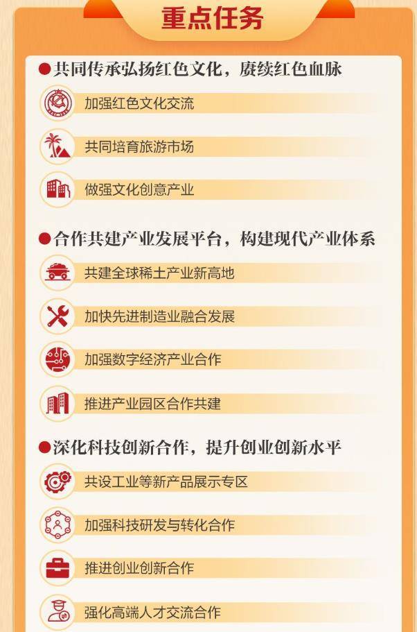 双方要细化加强红色文化交流、共同培育旅游市场、共建全球稀土产业新高地、加强现代农业合作、深化国资国企合作、加强金融领域合作、开展经贸互动交流等23条举措,推动赣州资源禀赋、区位优势、“1+5+N”主导产业与深圳市网络与通信、半导体与集成电路、新材料、生物医药、大健康等“20+8”战略性新兴产业集群和未来产业发展有机衔接,不断拓展对口合作的广度和深度,实现合作双方互利共赢。