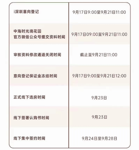 中海时光境的开盘节点如下,线下选房时间为9月23日。