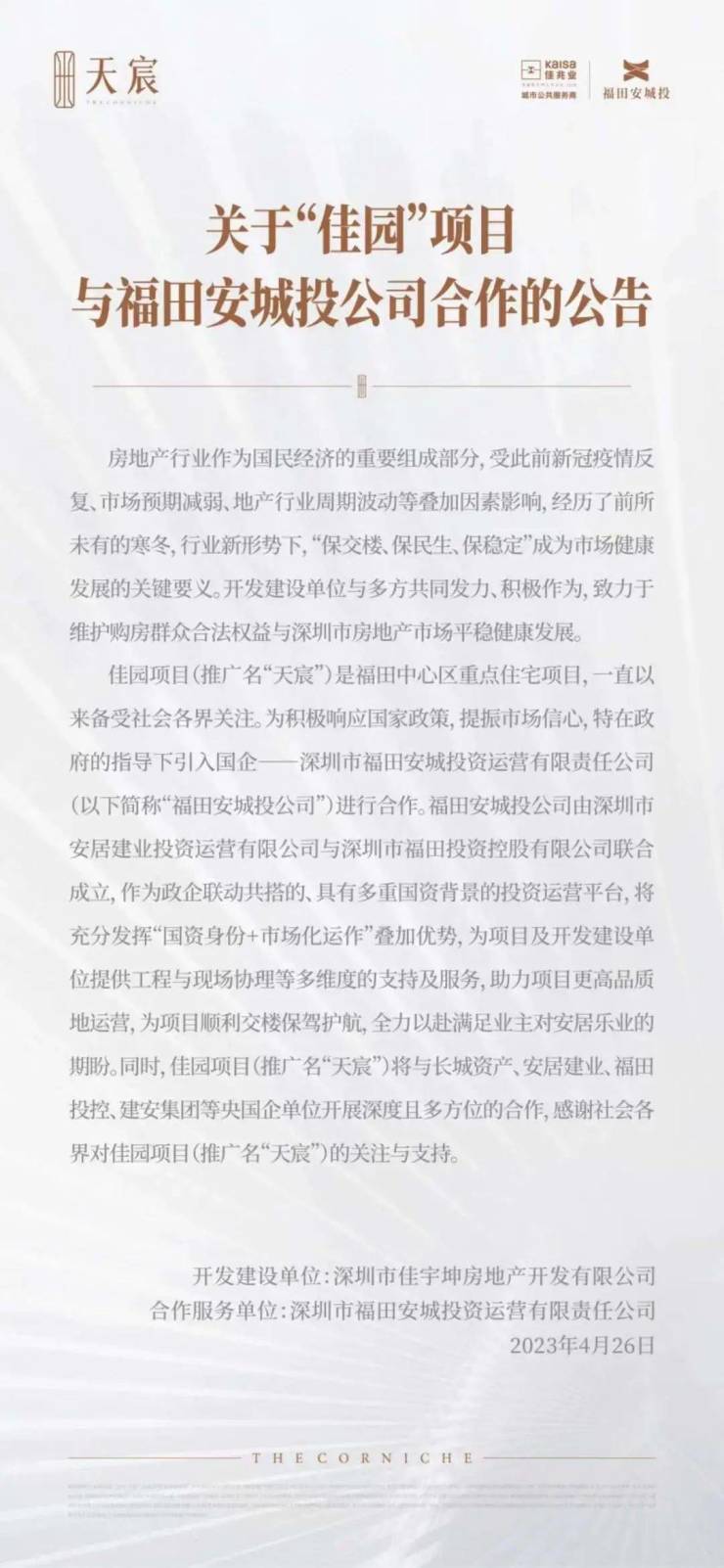 公告称,佳兆业佳园项目的推广名“天宸”,是福田中心区重点住宅项目,为积极响应国家政策,提振市场信心,特在政府的指导下引入国企—深圳市福田安城投资运营有限责任公司(福田安城投公司)进行合作。