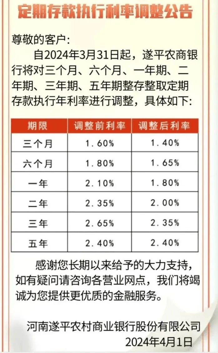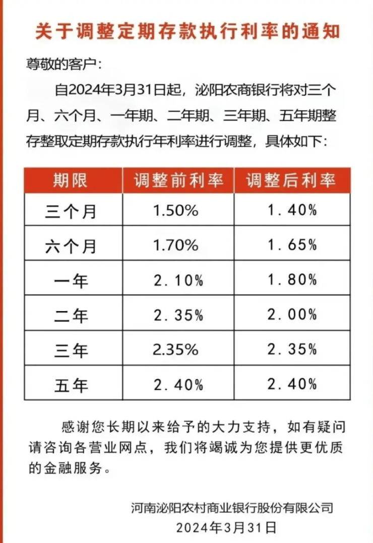 自3月31日起,泌阳农商银行将三个月、六个月、一年期、二年期定存利率从1.50%、1.70%、2.10%、2.35%下调最高35个基点至1.40%、1.65%、1.80%、2.00%。三年期和五年期定存利率则分别维持2.35%和2.40%不变。