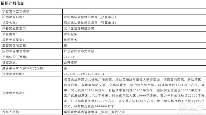 深圳北站超核绿芯项目(预算审核)计划在2024年1月1日-2024年3月1日,启动招标。