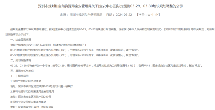 该地块是将宝中的03-29地块、03-30地块两宗商业性办公用地(C2)合并为一个地块,编号03-29。宗地占地面积约9998㎡,规划用地性质为二类居住用地(R2),容积率5.4,配套设施为社区儿童游戏场地。