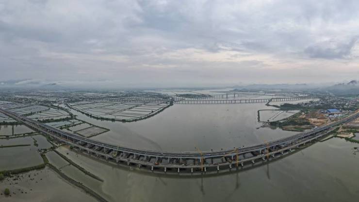长沙湾跨海特大桥全长 2108 米,为全线控制性工程,采用先新建右幅新桥再拆除既有特大桥的重建方案。