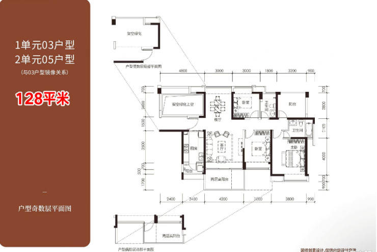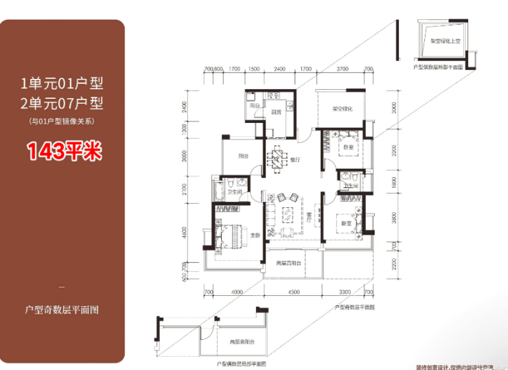 下面来看看户型图,建面约128㎡的产品为客餐厅的独立的经典通透格局;建面约143㎡为双龙抱珠的格局。
