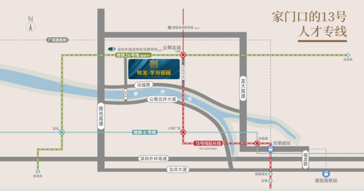 特发·学府朗园就在公明北站地铁口,未来“双轨”加持,地铁13号线(建设中)和26号线(规划中),都将在公明北站交汇换乘。13号线开通后,南下可直达留仙洞总部基地、南山高新园、深圳湾后海总部;26号线规划直通机场东站。项目东西两侧还有龙大高速和南光高速两大南北快速通道,高效便捷链接福田-罗湖中心及南山-前海中心。