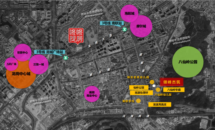 项目直线2.3公里外是龙岗中心城,龙岗中心城集合了龙岗中心城广场、万科广场、世贸中心、三馆一城等商业、娱乐休闲资源。