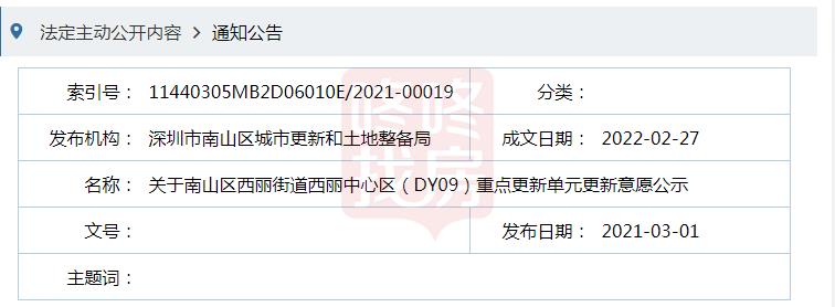 3月1日,南山城市更新和土地整备局发布《关于南山区西丽街道西丽中心区(DY09)重点更新单元更新意愿公示》。
