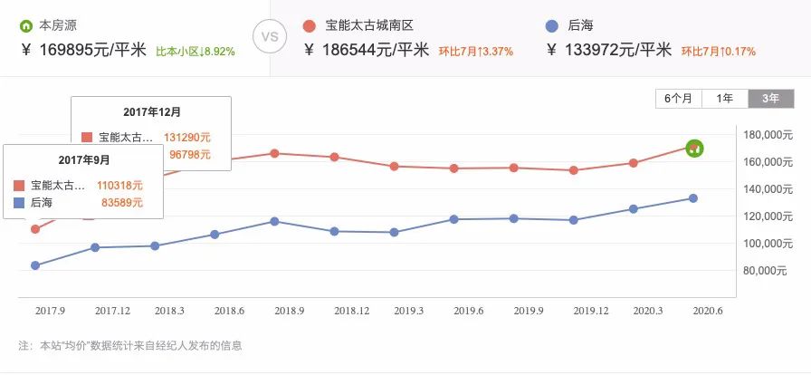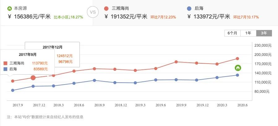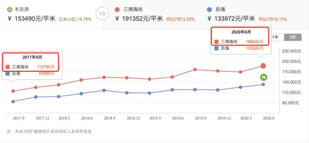 然而,在深圳湾学校学区内的三湘海尚,同样的三年从113790元/㎡涨到186840元/㎡,涨了39%!