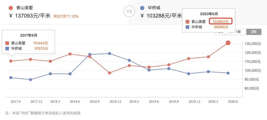 就拿华侨城里有名的豪宅香山美墅来说,三年时间从110444元/㎡涨到130863元/㎡,涨幅15.6%。