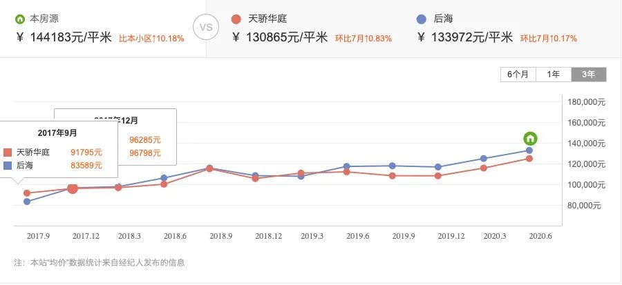 或者咱再往东看看红树湾片区,同样坐拥深圳湾海岸线却不在学区之内,红树西岸,2017年9月到12月,从128015元/㎡到130083元/㎡,涨了1.6%。