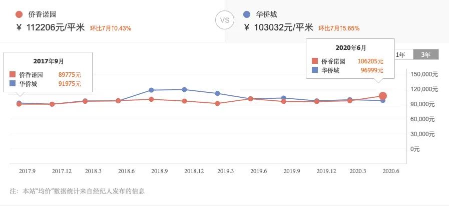 同样位于华侨城的侨香诺园,三年从89775元/㎡涨到106205元/㎡,涨幅15.4%。