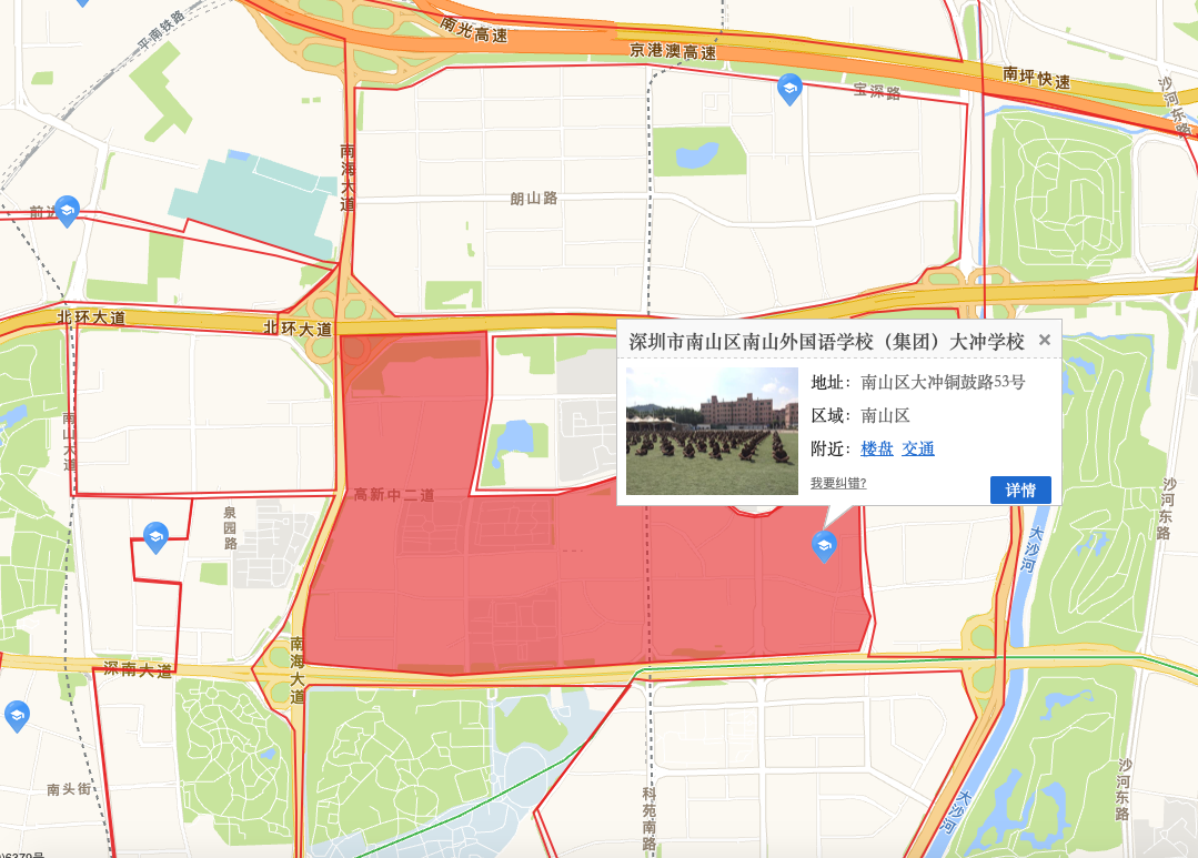 如此算来,四大7人的占比应为8%,与之前所传的2%有所不符。中考放榜后的近两周时间,关于深圳湾学校考了南山倒数的事传得沸沸扬扬——今年首届学生中考,87名学生中430分以上只有2人,420分以上9人。另一所被一并提起的是南山外国语大冲学校,今年第三次参加中考,一共172名学生,430分以上7人,420分以上29人。以430、420作为节点,是因为往年四大、八大的录取线大致在这。也就是说,深圳湾学校能上四大的2人占比2.3%,南外大冲能上四大的7人占比4%。大家之所以这么积极围观,是因为,首先,这两所学校所划学区房价与四大齐飞,结果成绩也同样地数一数二。只可惜,是倒数。村长给大家看看这两个学校的学区,你就十分能理解了。