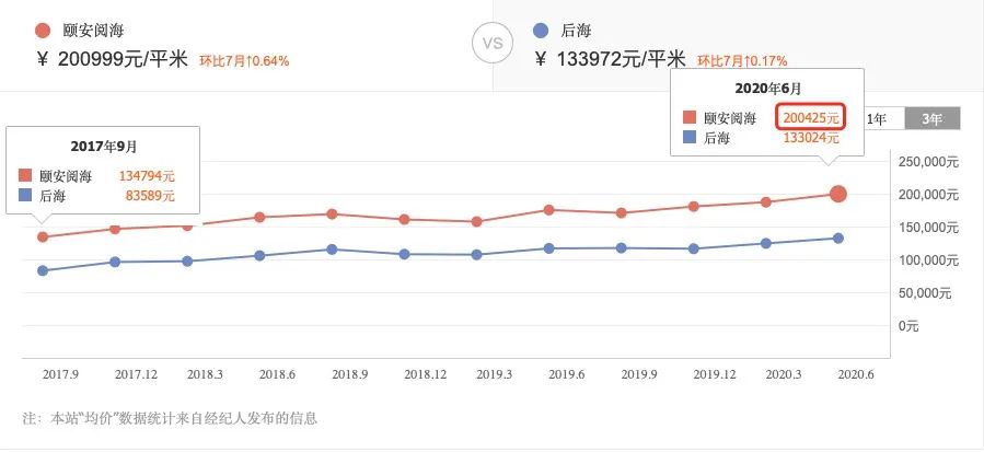 另一个学区内的颐安阅海,从134794元/㎡涨到200425元/㎡,涨了32.7%!