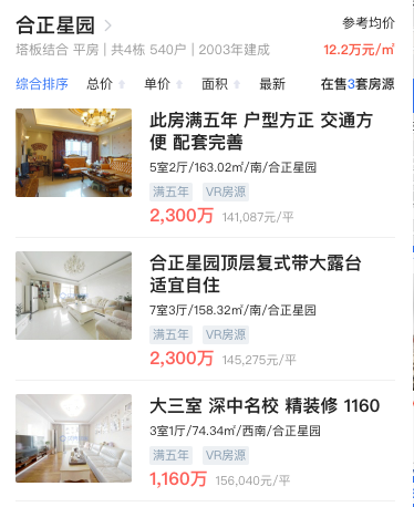 学区内的合正星园,现有房源单价在14-15.6万/㎡不等,总价在1160-2300万之间。
