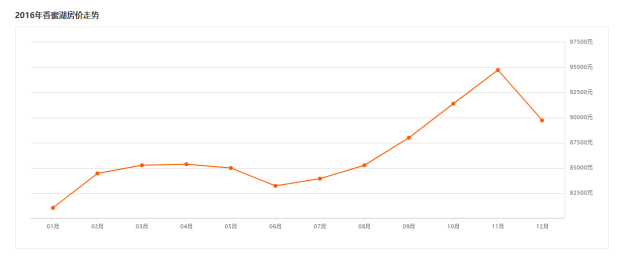 橙色代表上涨,绿色代表下跌。值得注意的是,香蜜明德于2016年首届中考成绩出炉,前后涨幅对比可知,在横盘持续了将近一年之后,六七月中考放榜,房价便持续攀升了上去。