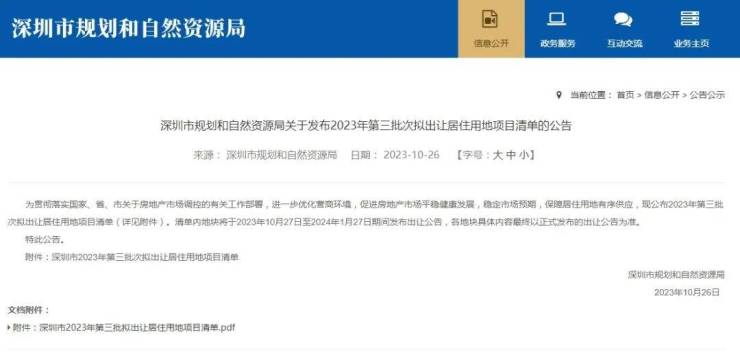 10月26日,深圳市规划和自然资源局发布了“2023年第三批次拟出让居住用地项目清单”。