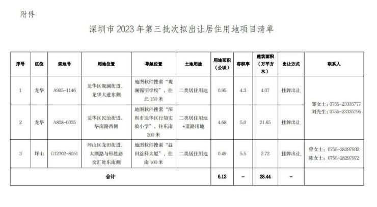 从公告来看,此次拟出让3宗宅地,分别位于龙华(2宗)、坪山(1宗),全部为二类居住用地,用地面积6.12公顷,建筑面积28.44万平方米。