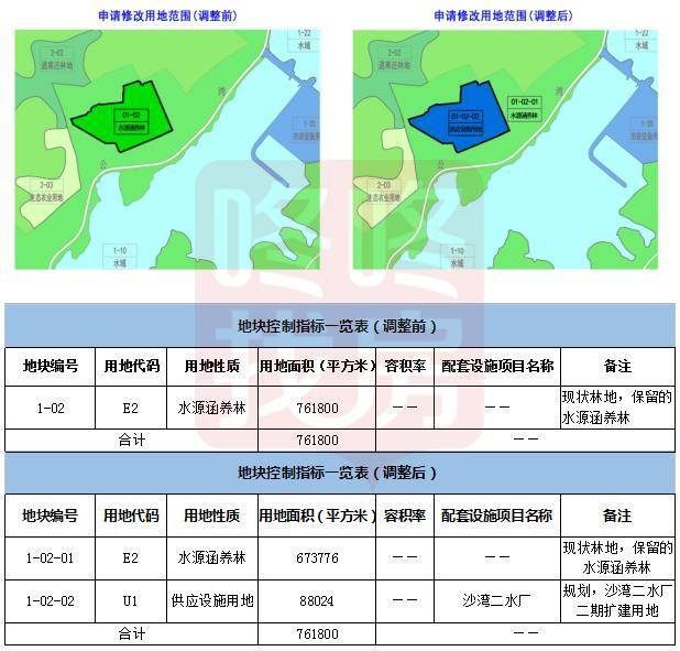 规划调整后01-02地块分为01-02-01地块及01-02-02地块。调整后,01-02-01地块用地面积为673776平方米,规划用地性质为水源涵养林(E2),容积率“-”,配套设施“-”,备注“现状林地,保留的水源涵养林”;01-02-02地块用地面积为88024平方米,规划用地性质为供应设施用地(U1),容积率“-”,配套设施为“沙湾二水厂”,备注为“规划,沙湾二水厂二期扩建工程用地”。