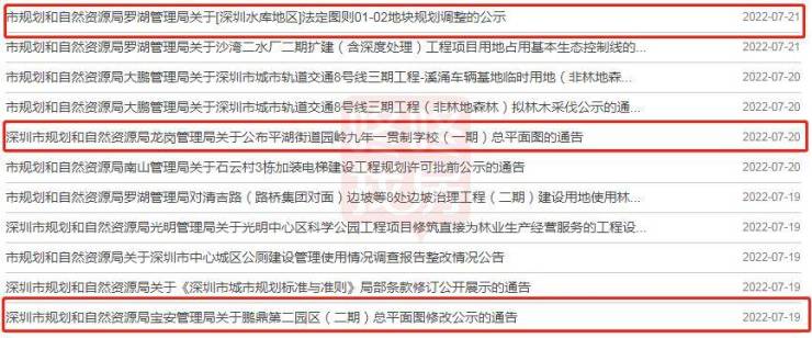 其中,平湖街道园岭九年一贯制学校(一期)总平面图公布;罗湖水库01-02地块规划调整,新增一块沙湾二水厂二期扩建用地;宝安鹏鼎第二园区(二期)总平面图修改。