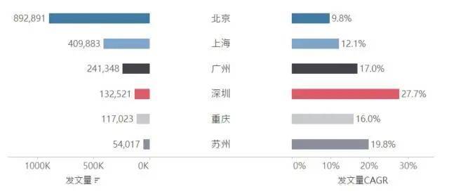 科研人才的聚集对于城市科研创新力至关重要。报告显示,北京科研人才规模最大,约有76万科研人员。同时,这6个城市的科研人才规模均呈增长趋势;其中,深圳市科研人才增速为31.4%,位居第一;苏州和广州分别以21.6%和20.9%的增速排在第二位和第三位。