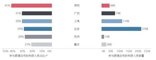 值得关注的是,深圳市的跨境合作(包括与港、澳、台的合作)程度高于其它对标城市,其2018-2022年间的科研产出跨境合作率 达41%。