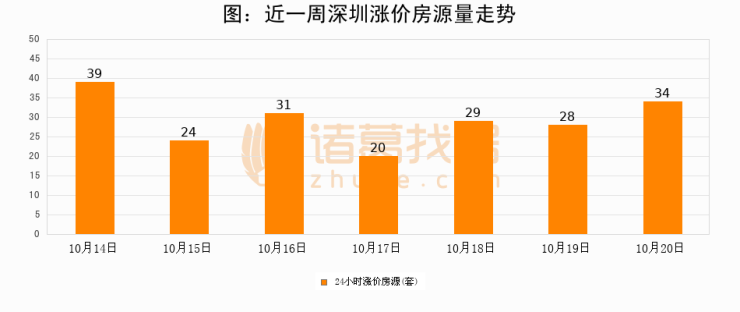 根据诸葛找房数据显示,深圳24小时涨价房源量为34套,较10月19日增加6套,环比上涨21.4%。与此同时,涨价房源占比小幅扩大,业主信心有所提升。