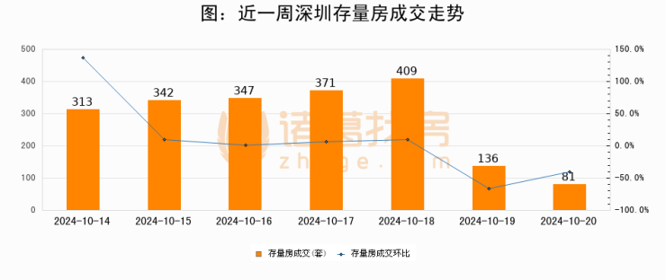 从存量房来看,2024年10月20日深圳存量房单日成交81套,比昨日减少55套,环比下降40.4%。从近一周存量房成交来看,深圳存量房日均成交套数为285套,10月20日单日成交81套,低于近一周平均水平71.6%。