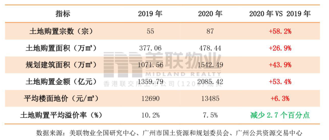 2020年广州住宅用地一共成交87宗,同比上涨58.2%;成交面积一共为478.44万㎡,同比上涨26.9%;规划建筑面积为1542.49万㎡,同比上涨43.9%;全年土地出让金一共为2085.42亿元,同比上涨53.4%;成交楼面均价为13485元/㎡,同比上涨6.3%;土地平均溢价率为7.5%,比2019年较少了2.7%。(详见表1)