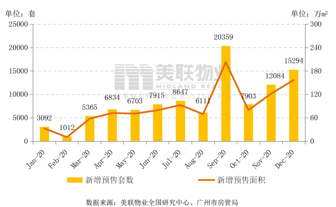 据统计,2020年广州新房市场共计101319套住宅产品取得预售许可证,环比大涨65.7%;预售面积为1046.67万㎡,环比大涨63.3%。从月份分布来看,受疫情影响,一季度住宅供应量较少,二季度较稳定,三季度出现全年供应高峰,9月份供应套数超2万,四季度表现较好,供应量逐步上扬。整体上,2020年广州新房供应速度加快、供货量加大,助力新房市场全年成交量上涨。(详见图4)